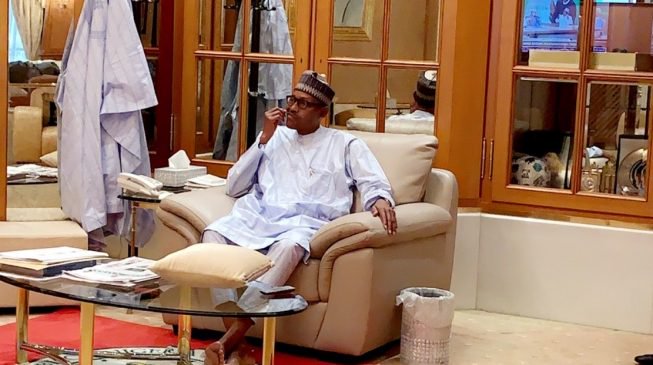 The picture showed Buhari relaxing as he picked what could be remnants of food he had probably just eaten.
