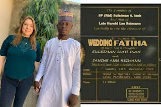 It partly reads, “The families of SP (rtd.) Suleman A. Isah and Late Harold Lee Reimann cordially invite the pleasure of… to witness the wedding Fatiha of their son and daughter which will take place, Isha Allah, on December 13.” Saharareporters